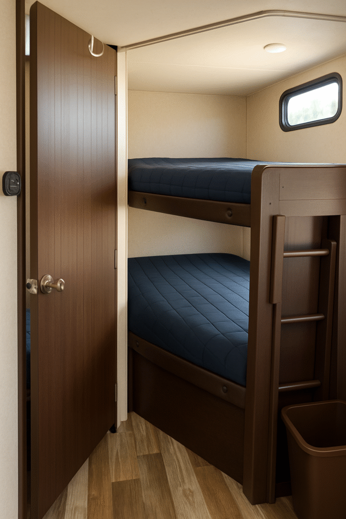 Our Purple Bay Vista Kingsport RV is perfect for families or groups looking for comfort and fun by the bay. It features a queen bed, a set of bunk beds, and a dining table that folds into an extra bed if needed—plenty of room for everyone to sleep comfortably.
